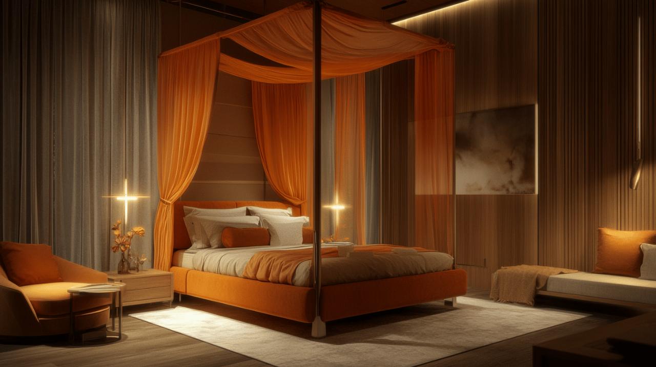 L'harmonie d'une chambre avec un ciel de lit orange s'enrichit naturellement avec des éléments coordonnés. Un tapis berbère aux motifs géométriques apporte du caractère à l'ensemble. Les lampions créent une atmosphère lumineuse subtile. La combinaison d'accessoires en bois naturel avec le orange génère une ambiance authentique. Cette teinte chaleureuse s'associe particulièrement bien avec des textiles aux tons neutres, créant un équilibre visuel parfait.